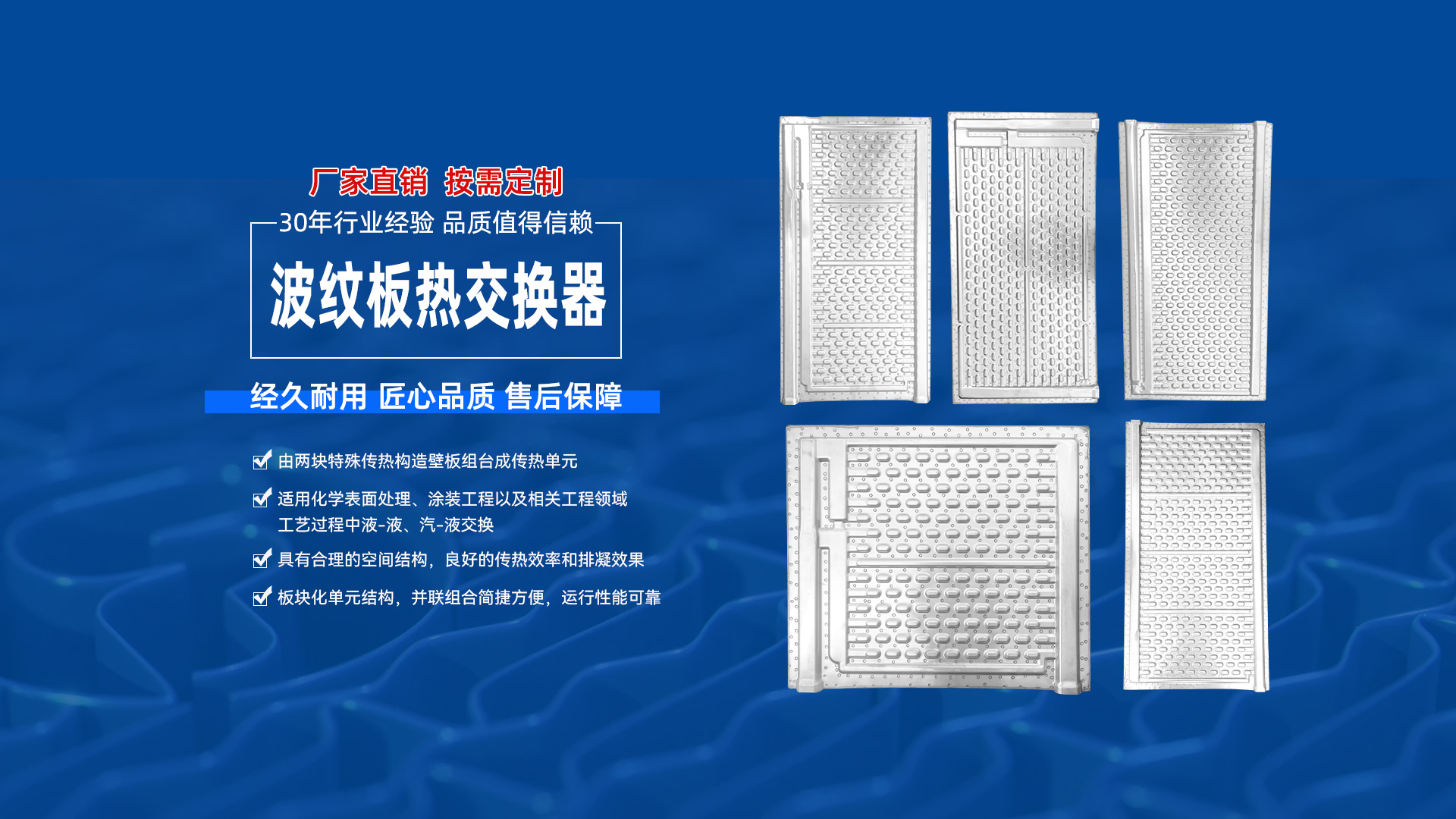 板式換熱器系列產(chǎn)品:BR04型、BR08型、BR15型、BR16型、BR20型、BR25型、BR25B型、BR-25C型、BR30型、BR35型、BR40型、BR55型、BR60型、BR60B型、BR100型、BR200型等型號(hào)不同規(guī)格的板式換熱器。 槽內(nèi)波紋板系列產(chǎn)品:BW0.6、BW1.0、BW1.2B、BW1.5-H、BW-1.5-Z等不同規(guī)格產(chǎn)品。并且錫惠在槽內(nèi)波紋板產(chǎn)品上有更深層的研發(fā)和探索逐漸成就了自己的核心技術(shù)優(yōu)勢(shì)。